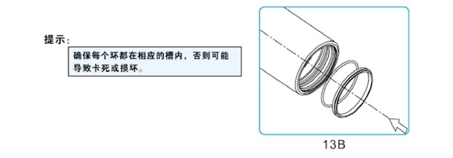 徹底檢查每節(jié)缸筒,充分潤滑油封套件和油封槽,給每節(jié)缸筒裝上新油封套件。由導(dǎo)向帶開始,然后是油封和 O 型圈、防塵圈,切勿把油封裝反有油封溝槽的一面朝缸筒里側(cè)裝完油封和 O 型圈、防塵圈。" />