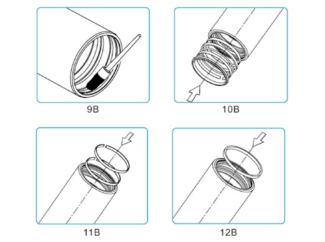 裝好一個(gè)缸筒后,將缸筒繼續(xù)向前推并將卡簧裝入上一節(jié)缸筒內(nèi)壁上對應(yīng)的卡簧